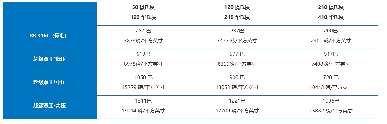 (3)请注意,SuperDuplex 不锈钢的最低工作温度为 -40°C