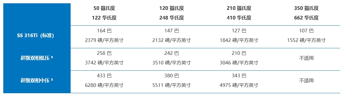 (3)注意:SuperDuplex 不锈钢的最低工作温度为 -40°C