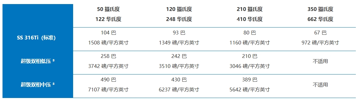 (3)注意:SuperDuplex 不锈钢的最低工作温度为 -40°C